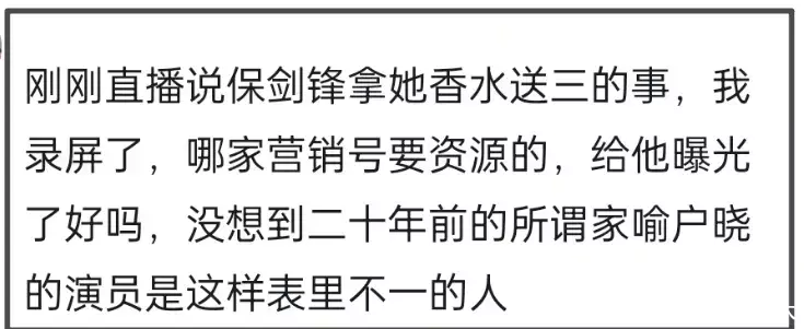 保剑锋碰到第一波公论声息时暗暗删评关评,从而导致公论升级,逼不得已又强装平缓怒放驳斥区,并更新时时。在偷香水故事传开后,保剑锋的驳斥区又被刷屏了,不少网友纷纷斥其内外不一,怒骂“他拿原配香水送小三”跌破眼镜。